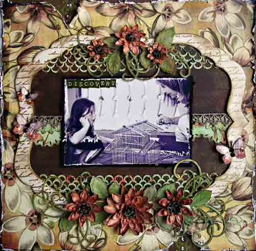 I used the beautiful Basic Grey Curio Papers on this layout.  The chipboard frame is from Technique Tuesday. I used my Large Elegant Word Stamp on the frame and embossed it with a gold embossing powder. I then went over it in ink. The inner section of the frame contains strips of punching. I trimmed the punched strips very close to the design so I could layer them seamlessly.