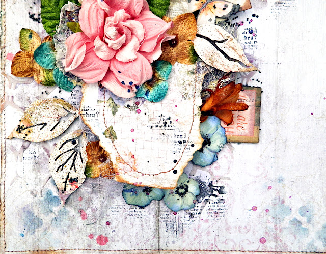 I used the BoBunny Butterfly Kisses papers to fussy cut the blue florals. I also used lots of gorgeous flowers from Prima and Petaloo. We carry the Petaloo Botanica Brown Floral Ephemera in the online store here which I used to layer among the pink and blue. I also used a vintage photo which came on a digital collage sheet in a past Scraps of Darkness kit.